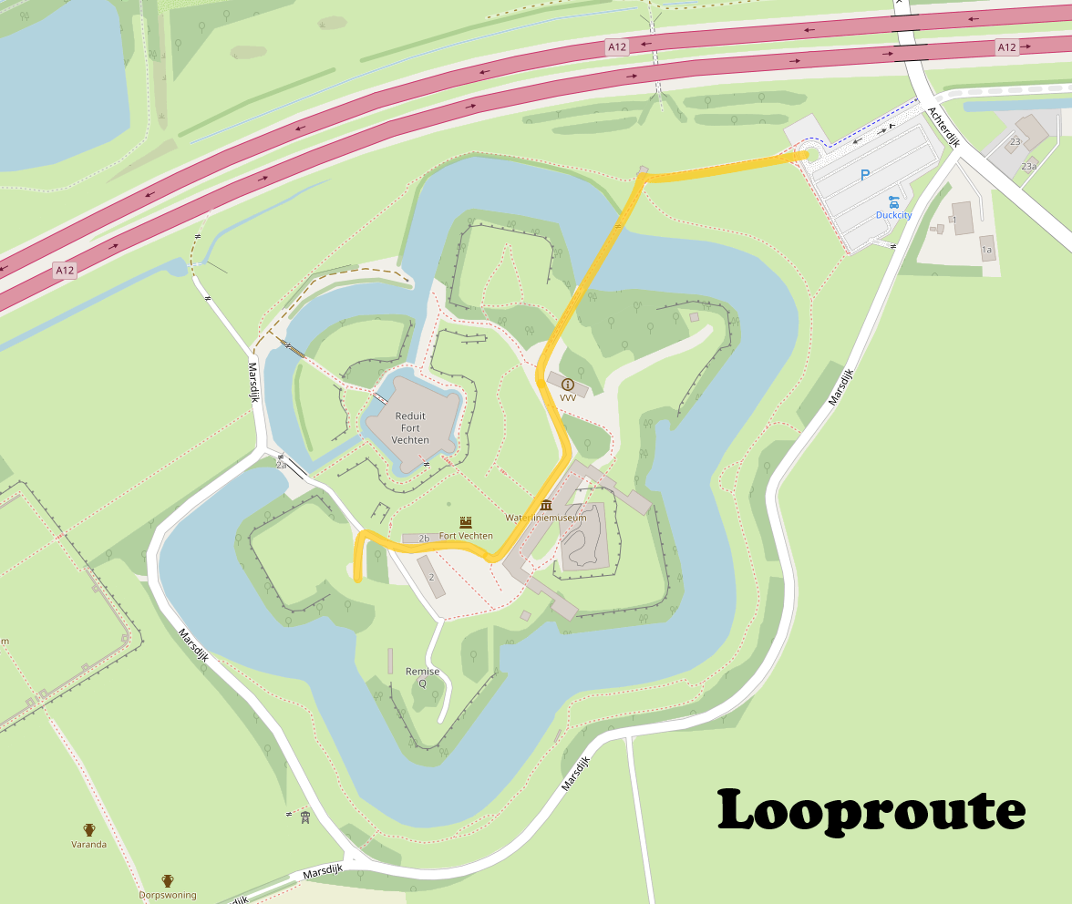 Vanaf de parkeerplaats loop je in ±10 minuten naar de trouwlocatie. Hieronder een afbeelding die de looproute weergeeft (volg de oranje lijn!).